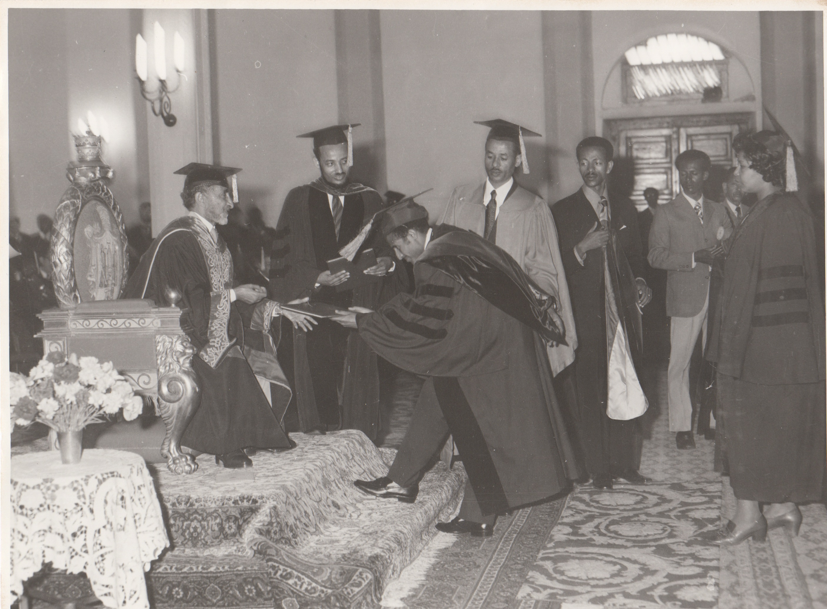 Moges receiving his MD degree from Emperor Haile Selassie in 1972; Dr. Aklilu Habte standing next to HIM